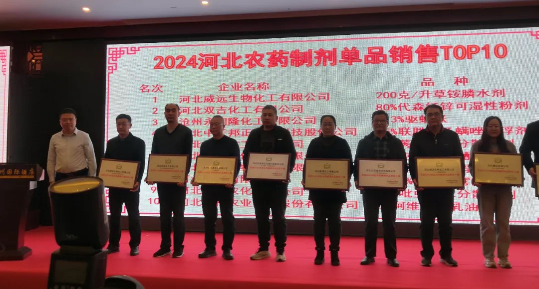 大會發(fā)布了“2024河北農(nóng)藥銷售收入TOP10、2024河北農(nóng)藥出口銷售收入TOP10、2024河北農(nóng)藥制劑單品銷售TOP10等榜單,利民股份子公司威遠(yuǎn)生化、雙吉化工分別榮獲河北農(nóng)藥銷售收入、出口銷售十強(qiáng)企業(yè)榮譽(yù)。利民股份產(chǎn)品200克/升草銨膦水劑、80%代森錳鋅可濕性粉劑、1.8%阿維菌素乳油分別榮獲河北省制劑單品銷售十強(qiáng)榮譽(yù)稱號。